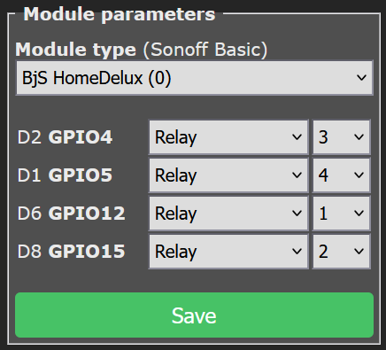 I then set all selected GPIOs to type Relay, numbering them according to the table above at Configuration -> Module: