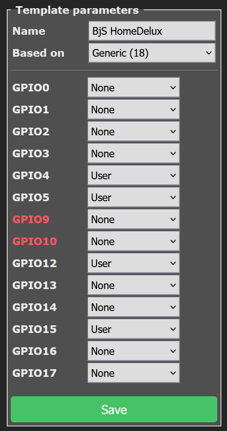 To control the push-buttons, I created my own template first registering my GPIOs as User in Configuration -> Template on the web page and all others as None: