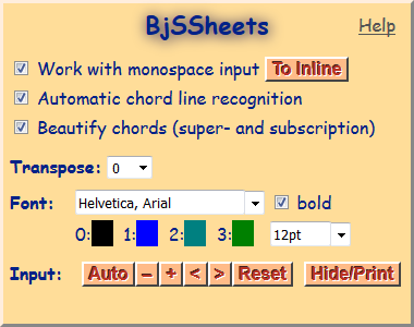 - Monospace: You have two lines for each song line; the upper with only chords and the lower with the sone line in such a way that each chord is placed above the char of the song line where it belongs. The Monospace script is converted into Inline script by the converter before the layout is created.